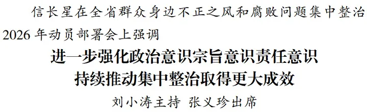 2月25日,全省群众身边不正之风和腐败问题集中整治2026年动员部署会召开。省委书记信长星出席会议并讲话。他强调,要深入学习贯彻席大大总书记在二十届中央纪委五次全会上的重要讲话精神,落实中央纪委国家监委部署要求,进一步强化政治意识、宗旨意识、责任意识,以更高标准、更实举措推进集中整治,务求取得更大成效、赢得群众认可。省长刘小涛主持会议。省政协主席张义珍出席会议。